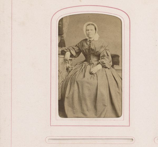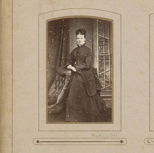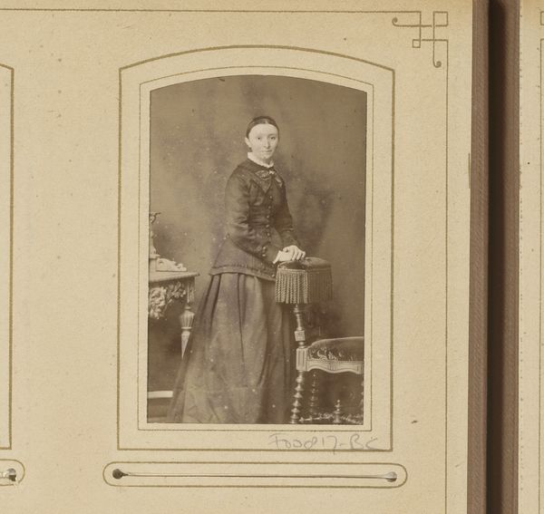 This photograph, titled "Portret van een jonge vrouw, staand bij een stoel" was created by Carte de Visite Studio. The composition arranges the subject in a way that guides the eye through a structured visual path. The young woman, positioned beside an ornate chair, presents a study in contrasts. Her simple dress with dark bands, against the intricate detailing of the chair, creates a play of textures that is quite striking. This dynamic isn't just aesthetic; it reflects broader cultural codes. The chair, a marker of status, is deliberately contrasted with the woman's modest attire, possibly challenging fixed notions of class and identity. The sepia tone adds another layer, evoking a sense of historical distance, and prompting us to question how we perceive historical subjects. The formal constraints of the carte de visite format add to this tension. Ultimately, the photograph invites a continuous act of interpretation, where each viewing can unpack different meanings embedded in its visual language.