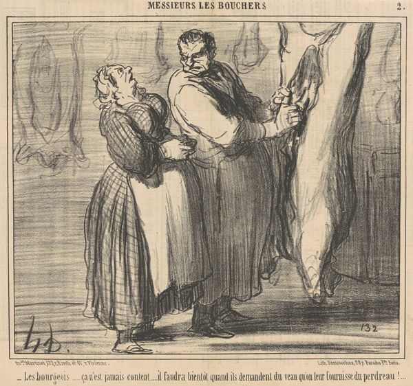 Editor: This lithograph by Honoré Daumier, likely from the 19th century, is called "Alliance des Bonapartistes et des Capucins." It features two figures embracing. There's something unsettling about the caricature; it feels sarcastic, even cynical. What do you see in this piece from a historical point of view? Curator: Well, given the title referencing Bonapartists and Capuchins, it's clear Daumier is engaging with the political climate of his time. We have to consider the social and political roles of these groups. The Bonapartists supported a return to the Napoleonic empire, and the Capuchins were a Catholic religious order. This alliance would have been perceived as quite contradictory, perhaps even opportunistic, given their traditionally differing ideologies. How do you think Daumier uses visual language to convey this critique? Editor: I notice that the faces are exaggerated, especially their noses, and the embrace looks almost forced, as if they don’t really like each other. Could this be a way of showing their alliance as unnatural or insincere? Curator: Precisely! Daumier was a master of social commentary through caricature. Consider the medium, lithography, which allowed for mass production and dissemination through newspapers like Le Charivari. This piece then becomes not just a personal artistic expression, but a direct intervention into public discourse. Daumier's work shows us the potency of images to shape public opinion and challenge authority. What did the general public feel about it at the time? Editor: So the intent wasn't necessarily artistic expression, but public critique, using art as a political tool. That’s a different perspective. I see how looking at the historical context makes this image even more potent. Thank you. Curator: And hopefully, this conversation encourages us to think about art not as something static, but as actively engaged with the society that produces and consumes it.