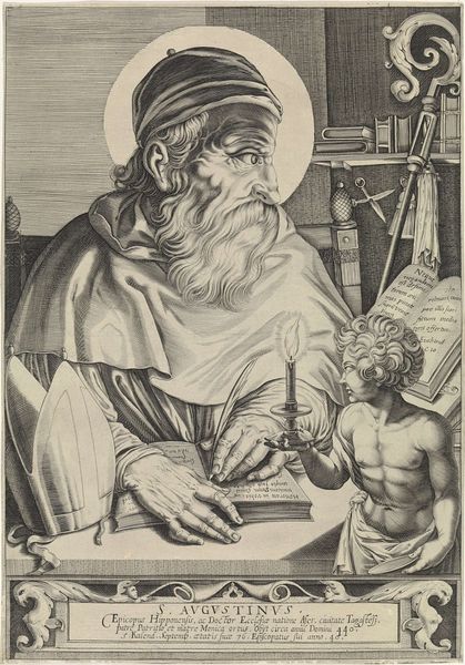 Editor: This engraving, "Lucas de evangelist," created in 1615 by Dietrich Krüger, has a quiet, studious feel to it. The detail is impressive. I’m intrigued by the ox behind St. Luke. What is it meant to convey? Curator: It's essential to recognize the ox as the symbol of St. Luke, deeply rooted in Christian iconography, but beyond the symbol it is useful to understand the history painting genre, very popular at the time, often with religious undertones or open meaning, so it's more than simple illustration. How does its inclusion affect the way viewers at the time, more attuned to these visual cues, would have understood the image? Editor: It gives him an identifying attribute, like a halo. It creates a visual context related to the Bible. How would Krüger have expected his audience to interpret it at the time, compared to us now? Curator: In 17th century Europe, prints were affordable art for middle classes; this piece would have carried layers of meaning tied to religious literacy and saintly symbolism. Patrons would have grasped St. Luke as not only an evangelist but also as an artist himself, emphasizing the divine inspiration behind artistic creation. Editor: So the image functions as a statement on artistic practice as much as it is religious representation? Curator: Exactly. The printing press had enabled a broad distribution of art, therefore works like these functioned on the social function of image circulation and a commentary of that. Look closer; What details strike you about the objects surrounding Luke? How would their interpretation differ today? Editor: The candle suggests both inspiration and the late hours of dedicated work. And while to us, these may feel like props in a constructed portrait, at that moment, they were also conveying religious authority within that social, cultural context. I never considered how essential understanding an audience is. Thanks for opening my eyes to that. Curator: Considering the intended audience transforms how we read and engage with these images, broadening our own appreciation of their artistic and cultural legacy.