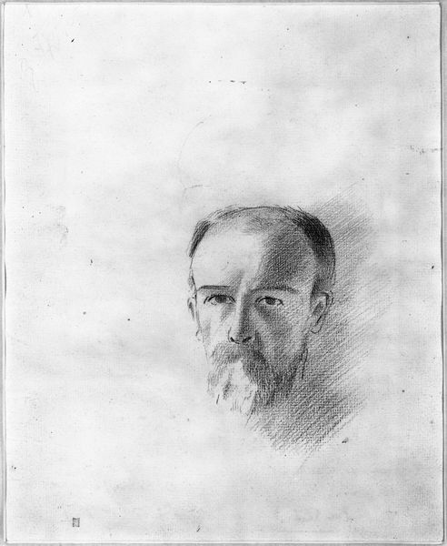 Editor: This is Franz von Lenbach's "Portrait of a Man," currently housed at the Harvard Art Museums. The stark contrast between light and shadow really draws my eye. What is your take on this piece? Curator: Note the artist's strategic use of chiaroscuro, a technique enhancing the dramatic effect. How do you feel this manipulation of light influences your perception of the subject's character? Editor: It seems to give him a stern, almost melancholic presence. Is that a fair assessment? Curator: Indeed. The composition directs the viewer's gaze directly to his face. Do you observe how the artist uses line and form to create a sense of depth and volume? Editor: The beard is very detailed. I appreciate the attention to texture. Curator: A keen observation. The portrait’s structural elements converge to construct a representation exploring the interplay between inner emotion and outward presentation. Editor: That's a fascinating way to look at it. I'll definitely be thinking about that as I explore more portraits.