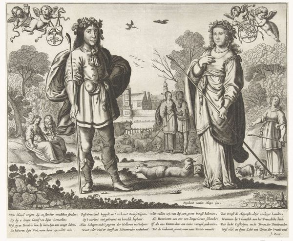 Curator: Here we have "Landscape with a Man and Woman Speaking a Moralizing Text," an etching by Jacob van der Heyden, dating back to 1608. It’s an early piece from the Dutch Golden Age. Editor: It strikes me as… well, stiff! The figures are so upright and formalized against this quite delicate landscape. It feels like a stage setting, almost theatrical. Curator: That stiffness is typical of the period, a carry-over from earlier printmaking traditions, though even within that context, there's something particularly declarative about their gestures. Note the man pointing towards the scenery, the woman holding up her hand in protest or… declaration? Editor: Precisely. They're clearly enunciating *something*. And there’s a bit of text beneath them, isn’t there? Looks like old German or Dutch? So, what’s the story they’re enacting, and why place it so pointedly in this detailed, almost placid landscape? Curator: The text, in old Dutch, indeed offers a moralizing commentary, hinting at themes of hypocrisy and the need for honest dealing. The figures act as allegorical representations, almost like characters plucked from a morality play set against a real, tangible place. It speaks to how the landscape wasn't merely a backdrop, but an active participant in conveying meaning. Editor: So, the placid setting is deceptive! It's interesting how van der Heyden utilizes the natural world to hold up a mirror to society's less savory aspects. Is the man, with his elaborate dress, representing earthly temptation, contrasted with the woman's righteous objection? Or perhaps, I'm reading too much into it? Curator: That's the beauty of art, isn't it? Open to our interpretations. Given the time period, rife with religious and political tension, one can’t dismiss that possibility. The figures' interactions, amplified by the landscape’s stillness, allow a powerful, quiet introspection for the viewer. Editor: Well, it certainly provides food for thought, doesn’t it? What starts as a quaint little scene blossoms into a rather potent social commentary. Van der Heyden has given us much to ponder about the appearances versus realities in society, then and perhaps, even now.