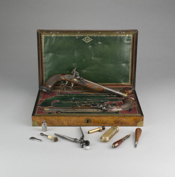 Curator: Good morning! Today, we're exploring a remarkable example of portable luxury: a "Pocket Canteen (Traveling Set)" crafted in silver around 1709-1710. The silversmith, Charles Overing, designed this compact baroque marvel currently housed at the Metropolitan Museum of Art. Editor: Oh, my! What strikes me is its austere elegance; the black leather case contrasts sharply with the gleam of silver instruments, as if masking extravagance within functionality. What were they actually used for, these silver tools? Curator: Indeed, a sophisticated question! This set embodies the height of refined travel for the elite of the 18th century. The fork, knife, and spoon are self-explanatory. The mysterious tools you noticed, these nozzle-like components are believed to have been used as drinking vessel adapters for imbibing different liquids while on the road. Editor: How incredibly elaborate for what appears merely functional! It's such a deliberate assembly of tools--necessities reimagined as signs of status. Were there deeper meanings invested in carrying one's own customized set around? Curator: Absolutely! Portable sets like these weren't mere utilitarian items. Consider it a manifestation of control and assertion of civilized identity amidst what would be viewed as 'uncouth' environments. Baroque-era nobles believed dining and drinking to specific codes reinforced their superiority and distinguished them. Editor: So the symbols reflect broader anxieties, class posturing playing out on the dining table, everywhere, through everyday rituals... A display kit! Imagine the quiet drama of unfolding this collection—asserting, "I am prepared. I am civilized." It does resonate still with contemporary high-end travel accessories. Curator: You've nailed its emotional crux—this is about psychological comfort through symbolism, wouldn't you say? Possessions becoming symbolic of identity, civilization a sort of symbolic currency when one travels outside one’s bubble. Editor: It certainly complicates this shiny travel set with weighty cultural codes. A glimpse into an era when every action, however simple, turned theatrical, carrying heavy connotations about oneself and one's status. I look at this traveling set differently, imagining my little world of cultural presumptions accompanying me on the go. Thanks for enlightening me today!