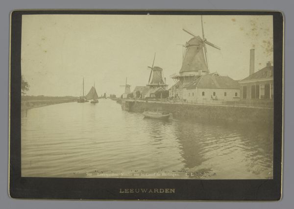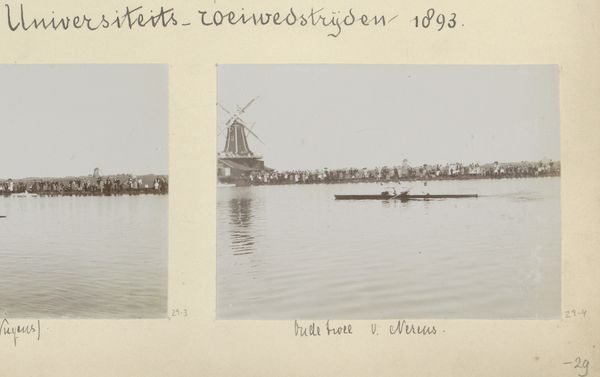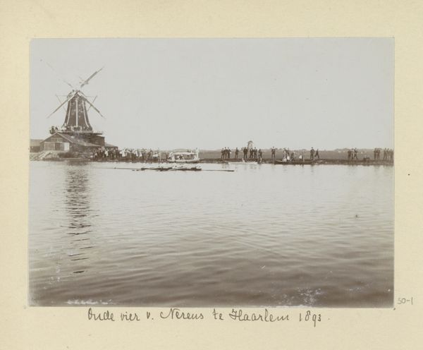 Editor: Here we have Hendrik Herman van den Berg’s gelatin-silver print from 1893, titled "'Jonge Vier' van de Amsterdamse roeivereniging Nereus tijdens de Varsity van 1893 in Haarlem." The photograph captures a rowing race, but there's something very serene about the sepia tones and the soft focus. It almost feels dreamlike. How would you interpret the composition of this piece? Curator: Observe how the artist distributes tonal value. The photographic gelatin silver medium yields an almost monochromatic scale, stratified horizontally to delineate space. The artist leverages this atmospheric perspective, diminishing detail in the background elements such as the windmill. This directs our gaze, primarily focusing on the horizontal lines that divide the photo; Water, boat, onlookers, and the upper ether. Do you perceive this formal construction as hierarchical or something else? Editor: Hierarchical? Perhaps... the waterline certainly feels weighty, but the sky feels equally significant, balancing it out. What's the effect of capturing motion through such a still medium? Curator: Indeed, this intersection warrants closer analysis. Gelatin-silver print technology fixes time; yet, here it creates the semblance of motion, subtly evoking Impressionistic ideals through tonal gradation. This subverts expectations of mimetic capture by creating a dynamic aesthetic object within a rigid plane, a paradox that foregrounds material potential. Do you notice any compositional elements creating movement? Editor: Now that you mention it, the blurry ripples in the water and the repetition of figures along the bank suggest a fleeting moment. Thank you for elucidating the artistic dynamism! I initially underestimated how intentional those apparent imperfections must be. Curator: Precisely. Recognizing formal tensions, we perceive greater meaning in otherwise unassuming artworks.