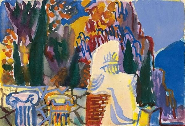 Bela Czobel, born in 1883, painted this piece with oil paints around 1920, and it feels like a total immersion in process. The way he attacks the canvas feels urgent, like he's trying to capture a fleeting moment. Look how the colours are laid down in these thick, juicy strokes, especially in the tablecloth, where blues and whites clash and blend, making it almost vibrate. There's this tension between representation and abstraction. You can make out the objects on the table, the tree looming over, but they're all rendered with such expressive, almost violent, brushwork. The dark, almost black marks defining the tree feel raw, like a charcoal sketch beneath the colour. The whole thing has a restless energy. It reminds me of some of the Fauvist painters, like Vlaminck, who weren't afraid to let their emotions spill out onto the canvas. It's like Czobel is saying that painting is as much about feeling as it is about seeing, a conversation still going on today.