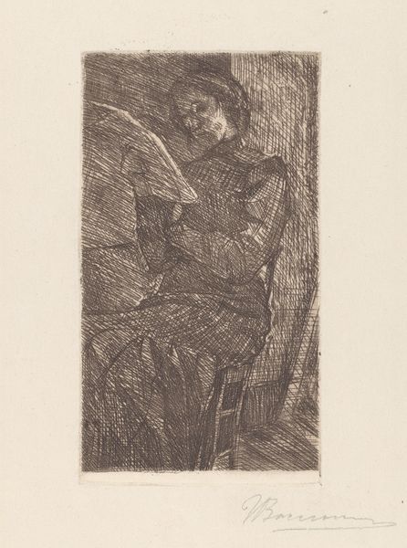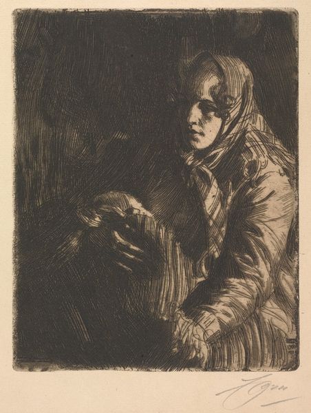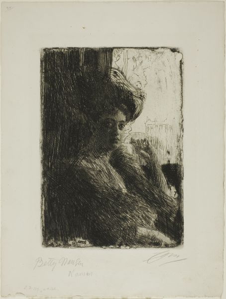 Curator: We’re looking at “Mme. Olga Bratt,” an etching created in 1892 by Anders Zorn. It presents a compelling portrait of a woman adorned in a rather elegant top hat. Editor: It feels somber, almost cloaked in shadow. The line work is so dense; she seems both present and obscured. What do the symbols communicate, hidden in that density? Curator: Consider the labor involved. Zorn, using etching, meticulously worked the metal plate, controlling line, texture and depth. This reproduction method made art more accessible, widening its consumption beyond traditional painting's elite circles. Editor: But the woman herself. Her posture, her attire. The high hat. The averted gaze speaks of status but also perhaps, a studied, almost melancholic pose. It’s like a concealed narrative, relying on conventional markers to create the illusion of a private psychology. Curator: Precisely. Etchings offered artists new creative freedom in mark-making but were also becoming commodities for bourgeois society. Note how the sharp, controlled lines simultaneously detail fashion while retaining this “handmade” feel. It's an intriguing tension in material practice and how the sitter consumes. Editor: Yes! And the top hat in this image specifically feels significant. A top hat might denote upward mobility or professional engagement but in a female representation is disrupting these familiar cultural readings of her presence within urban life. I find it is less an accoutrement of societal advancement and instead almost a disguise! Curator: The way the figure is presented offers social commentary through industrial means. He critiques and caters to bourgeois taste, embedding subtle narratives within his line and form. Editor: A paradox indeed, showcasing the subject while obscuring any trace of emotion. The effect reveals cultural tensions and contradictions related to both wealth and status. Fascinating. Curator: So it is. Considering the etching process in contrast to her fashionable attire certainly enriches our viewing experience of the print. Editor: Yes, it invites you to appreciate how codes and visual markers shift to shape ideas surrounding portraiture. I find myself asking new questions surrounding those traditional signifiers.
