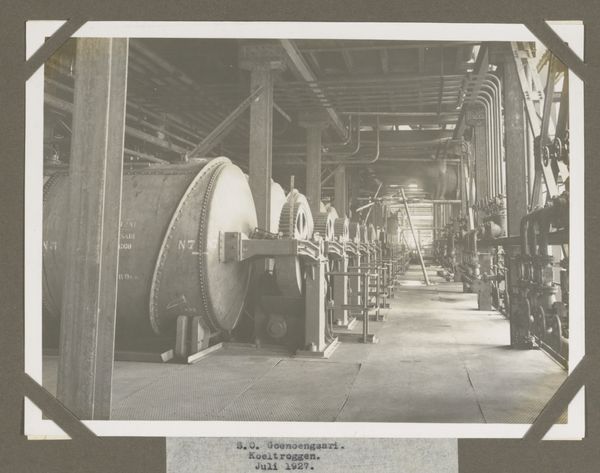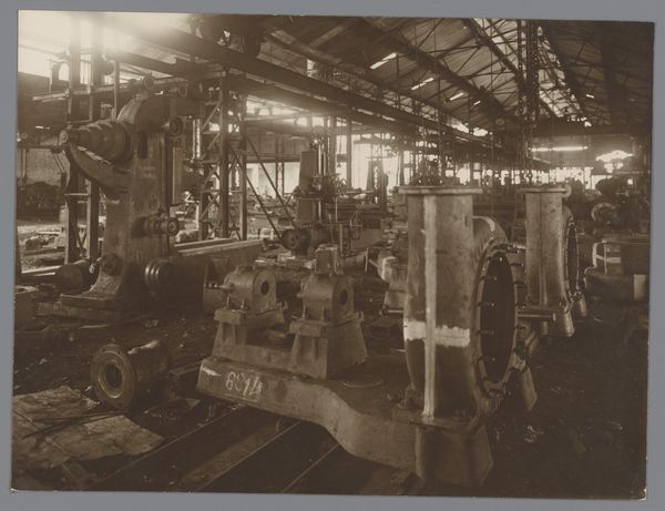 Editor: This is "Constructiewerkplaats" from around 1929-1932 by Atelier Umbgrove, a black and white photograph. The scene is full of people working in what seems to be an industrial space. The geometric forms of the machines contrast with the laborers, giving the scene an interesting human quality. What catches your eye about it? Curator: It is the depiction of labor within the means of production that really grips me. The photo’s monochrome palette, of course, simplifies textures and volumes, forcing us to contemplate the materiality of the factory—steel, wood, earth, all present to fuel this workshop’s means of constructing... what? What kind of object is this factory manufacturing, what specific type of labor is it performing, and to whose benefit? These are key questions. Editor: Those are great questions! It's difficult to determine from the photo. Are we seeing a kind of landscape emerge in this picture? The workers almost seem small and insignificant next to all that heavy machinery. Curator: Indeed! Notice how the photograph equalizes tones and values, which further enhances the geometric abstraction and suggests the interchangeability of labor within industrial manufacture. This composition evokes concerns about humans subsumed by machines and alludes to the rise of industrial production affecting both labor and consumption, therefore dissolving prior boundaries of landscape or genre paintings. Editor: It is a very grounded and comprehensive approach. Considering the production's means invites broader socio-economic contexts than aesthetic value judgements. It’s changed how I appreciate the artwork! Curator: Precisely! The point isn't to just "see" the image, but to interrogate its production, its subject matter, and how these intersect with broader power structures and material realities. The social context that has emerged has transformed my understanding of the photograph.