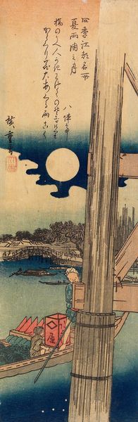 Curator: Brrr, just looking at it makes me feel cold. There's a hush, a sense of suspended time... like the world is holding its breath. Editor: We’re observing "Shōgo Ferry Landing," a woodblock print from 1884 by Kobayashi Kiyochika, a master of Ukiyo-e, blending traditional Japanese techniques with Western influences. Curator: Kiyochika had such a unique eye. The way he captures light, even in a snowy scene like this, it’s not just documentation; it’s pure feeling. The isolation of the figures! Editor: Isolation, yes, and consider the political climate. This was a period of rapid modernization in Japan. Artists like Kiyochika documented both the allure and alienation that came with that transition. He uses realism here. Do you think there's an exploration of class? Curator: Perhaps! One is laboring, moving the boat, while the other appears to be… well, contemplating something. Is it a prayer? Or perhaps he is trying to figure out how he will provide food for his family after a hard winter season. I love that ambiguity. It opens it up. The bare trees. It hints at the season's brutality and scarcity, if we look through our historical lenses. Editor: Definitely. It's a poignant image. Consider the very materiality of the work. The woodblock print, traditionally accessible to the masses, allows Kiyochika to depict everyday life but elevates it through artistry. A visual form of storytelling for a culture in flux. And did I read a sign in there, an official seal perhaps? Curator: Ah, it’s so human, even in its sparseness. A reminder of our vulnerability, of nature's indifference and the enduring need for connection, don't you think? Editor: Absolutely. Kiyochika invites us to reflect on a moment of transition, the individuals caught within the broader social and economic forces shaping their world. Curator: And it’s all so delicately rendered. Makes you think about the weight of each individual choice. Editor: Precisely, it reminds us to consider history as more than dates and events, as a tapestry of individual experiences, struggles, and moments of resilience.