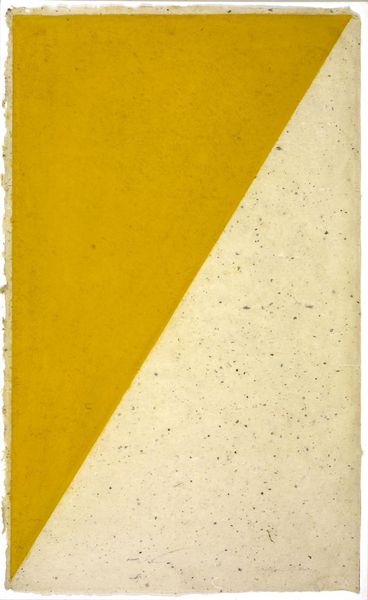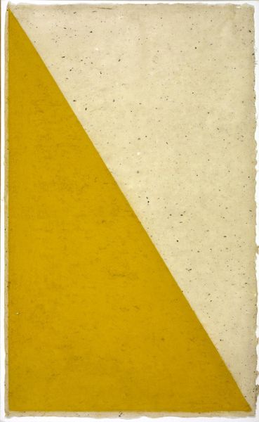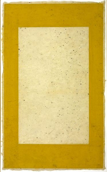 Curator: Stephen Cox's "Untitled" presents us with a striking, rectangular form rendered in a vibrant yellow. What's your initial impression? Editor: That yellow immediately evokes feelings of warmth, sunlight, even a primal energy. It's like a visual representation of pure potential. Curator: Indeed. Cox, born in 1946, often blurred lines between sculpture and painting. Look at how the handmade paper becomes integral. The speckled texture and deckled edge elevate it beyond mere support. Editor: This yellow rectangle...it’s less a shape, more a symbol. The color of divinity, enlightenment, and also caution. Its simplicity belies complexity. Curator: The labor involved in creating that surface is significant. Each mark tells of process, deliberate application, perhaps even a meditative repetition. Editor: I see the enduring power of basic forms, the rectangle as a window to the sacred. This piece quietly insists on the timelessness of human experience. Curator: A lovely summation. Cox challenges us to value the intrinsic qualities of materials, their transformation through human hands. Editor: The art invites the viewer to see beyond the surface and search for the profound meanings hidden in plain sight.