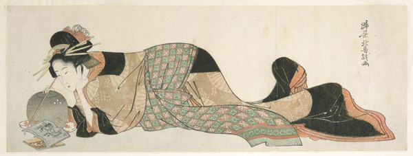 Curator: Today, we’re looking at “Minnend paar achter kamerscherm,” or "Lovers behind a screen," a drawing by Sugimura Jihei, dating from around 1740 to 1745. It’s currently housed here at the Rijksmuseum. What are your initial thoughts? Editor: It strikes me as simultaneously playful and intensely private. The limited palette emphasizes the stark contrast between the figures and the ornate screen, amplifying the sense of intimacy but somehow not. Curator: Indeed. Let's analyze that contrast. Jihei masterfully employs line – confident, unwavering strokes defining the figures, juxtaposed with the denser, almost chaotic linework within the dragon motif on the screen. This suggests a structured opposition. Editor: Precisely. That screen—dragons are a complex symbol aren’t they? Often signifying power and protection but also chaos. Here, the dragon’s fierce energy, contained by the screen, juxtaposes wildly with the overt display of affection, suggesting a hidden or controlled passion. And aren’t we, as the viewer, positioned as voyeurs looking into their private moment. Curator: An interesting perspective. Looking at the purely formal composition, notice how the intertwined limbs create a dynamic, almost self-contained unit. The artist frames this unit using the solid form of the screen, underscoring its separateness from the space we, as viewers, occupy. The dragon exists to create the separation of observer to subject. Editor: Yes, I agree. The very fact it’s presented as ukiyo-e artwork—the woodblock prints that capture everyday life—yet presents an illicit love scene hints to its importance in its original context, doesn’t it? To capture human desire and passion as part of this life, without sugarcoating its animalistic rawness or societal restraints speaks of societal context through a single image. Curator: So we might conclude that while formally concise, the work layers narrative and emotional tension via a shrewd structural balancing of human form and symbolic barrier. Editor: Precisely. It uses a carefully controlled graphic vocabulary to hint at the unrestrained. Jihei captures universal desires and unspoken social commentaries of its period via cultural cues like the symbolism on the screen to invite us in. Curator: A perspective that highlights the artwork’s layered dialogue between surface and depth, a great reading. Editor: A graphic portrayal that is as captivating as it is culturally loaded.