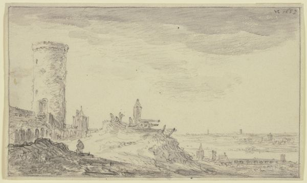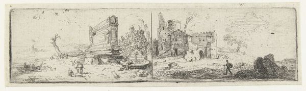 Curator: Here we have Harmen ter Borch's rendering, completed before 1677, titled "Ruïnes van de Campo Vaccino in het Forum Romanum." It's held here at the Rijksmuseum. What are your initial thoughts? Editor: Stark, yet tranquil. The sepia tones lend an almost dreamlike quality to the crumbling architecture. The composition, though, is strikingly balanced—a sort of controlled decay. Curator: Absolutely. The use of ink on paper underscores the accessibility of landscape drawings and their function within an artist's broader practice. How Ter Borch negotiated the marketplace for materials is worth considering; his ink, paper, and time. Editor: True, but consider the rendering itself. Notice how the artist captures the play of light and shadow across the ruined structures. There’s a sophisticated handling of perspective, creating depth and drawing the eye into the historical heart of the Roman Forum. The semiotic weight of the decaying structures speaks of time's passage and the transience of power. Curator: I agree. These ruins weren't just aesthetic objects but carried real social significance for seventeenth-century viewers. Remember the Grand Tour, where visiting such sites and collecting artwork documenting them signified class and afforded the opportunity to take these symbols of prestige home, a reflection of expanding networks of trade and aristocratic control. Editor: I’m compelled by the column as a structural motif: its lines draw the eye upwards, yet its brokenness suggests a narrative. It prompts us to question: what forces brought about its demise? The interplay between verticality and fragmentation establishes a dynamic tension, almost architectural poetry. Curator: And this wasn't simple representation; these artists selected viewpoints to shape political discourse, carefully omitting signs of current life and emphasizing the decline of the old empire. The labor of creation also reflects the colonial and cultural aspirations of that time. Editor: Yes, these structural contrasts contribute to the drawing’s lasting impact. Through Ter Borch's artistic processing, we grasp both historical presence and human impact. Curator: Looking at these processes informs my views, while seeing structure deepens yours. It highlights diverse facets of this cityscape—from historical context to the aesthetic mastery apparent in Ter Borch’s approach.