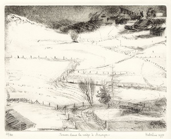 Muirhead Bone created this drawing, titled 'In the Galicia, Spain,' using pencil and wash on paper. A landscape unfolds, articulated through subtle tonal variations of grey and black. The materiality of the wash gives a fluid, almost atmospheric quality, softening the structural lines. The composition is divided into horizontal bands. The foreground is densely marked, suggesting a tactile immediacy. Our eye is led towards the lighter middle ground, then further into the distance to the light grey sky. Bone employs the formal language of landscape art, while also reflecting early 20th century aesthetic concerns, like an emphasis on direct observation and simplification of form. The drawing may be interpreted as a visual signifier for the cultural and artistic values of its time, emphasizing the importance of subjective experience and honest representation. Notice the delicate balance between representation and abstraction, and how this contributes to the artwork's contemplative mood.