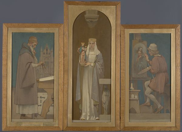 Curator: Here we have Georg Sturm’s "Boekverluchting - Edelsmeedkunst - Naaldkunst," created between 1876 and 1885, a tempera painting showcasing remarkable symbolism and elements of academic art. Editor: Immediately I get a sense of serene industry from this piece, almost a sacred devotion to craft. It’s as though each figure is engaged in a quiet, meditative practice, a slow dance of hand and material. Curator: Exactly. Sturm emphasizes process. The painting seems to elevate book illumination, goldsmithing, and needlework to the level of high art. Consider the division of labor—the intellectual labor of the monk transcribing manuscripts, juxtaposed with the artisan's meticulous creation. Editor: It feels like the gold leaf reflects both a reverence and value assigned to such careful creation. It whispers tales of guilds, workshops, and the individual artist's hand at work. What fascinates me is how such a formal piece, likely meant to represent ideals, connects so deeply with everyday actions, as we understand devotion and craft through everyday life. Curator: And how materials contribute to this impression of refinement. The medium of tempera gives a soft matte texture, creating a subdued atmosphere overall which contrasts so wonderfully with that gold ornamentation. It calls attention to labor in all aspects of material culture production. Editor: What do you make of the central figure with the bishop’s mitre and crozier? Are we to imagine her as some sort of personification of creativity, blessed inspiration, the muse maybe? Curator: A fascinating point! It suggests these arts, from script to stitch, are divinely sanctioned, adding further to its material and cultural significance. These objects represent something beyond simple utility, speaking of the intersection between commerce, spirituality, and societal structures. Editor: Considering how objects acquire value over time and by context… thinking about the relationship between art and use, production and purpose… Curator: Sturm offers a glimpse into the ways material culture reflects and shapes a society's values. Editor: Precisely. It is a compelling meditation on both artistic creation and social responsibility, how even our hands shape the world.