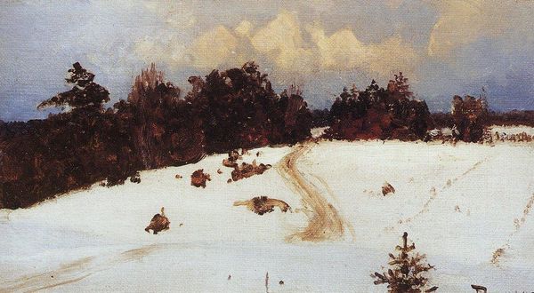 Vasily Polenov created this oil on canvas painting titled "Winter." The canvas is dominated by snow-laden fields under a muted sky, creating an immediate sensation of stillness. Polenov's brushstrokes are visible, giving a tactile quality to the snow's surface. Patches of trees punctuate the horizon, their dark forms contrasting sharply with the brightness of the snow. The painting's composition invites contemplation of the landscape's structural elements. Polenov explores a semiotic interplay between the cold, passive expanse of snow and the active, vertical lines of the trees. This duality suggests an attempt to capture the essence of winter through its visual extremes. The painting challenges our perception of space, as the horizon is subtly blurred, complicating any clear demarcation between earth and sky. In essence, "Winter" is not merely a depiction of a season, but an invitation to engage with the visual and emotional dimensions of a landscape transformed. Polenov's masterful rendering invites us to continuously reinterpret and reimagine our relationship with the natural world.
