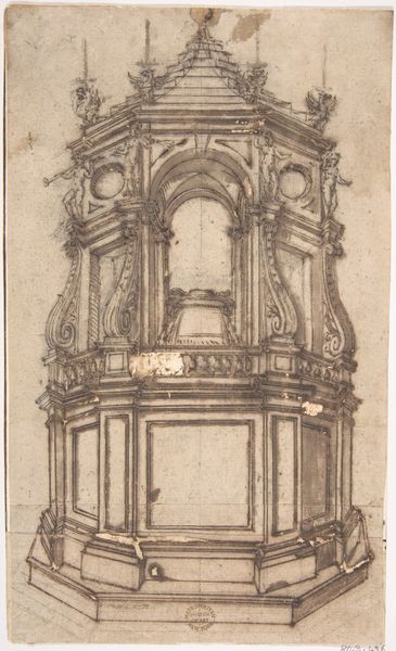 Giovanni Battista Foggini created this pen and brown ink drawing, titled "Designs for Bed Alcoves," which resides in the collection of the Metropolitan Museum of Art. Foggini lived in a time and place, seventeenth-century Florence, where the patronage of the powerful Medici family shaped not only politics, but art and culture as well. Here, we see the artist’s plans for a luxurious, private space. The bed alcove, with its ornate details, speaks volumes about the significance of intimacy and rest, particularly for those of high social standing. How did the idea of personal space intersect with one's identity, especially when class defined so much of daily life? The historical context is important: luxury and artistic patronage often came at the expense of the working classes. Foggini's design invites us to consider the relationship between aesthetics, power, and the broader societal structure of his time. The drawing provides a window into the material culture of the elite while prompting questions about those whose labor made such opulence possible.