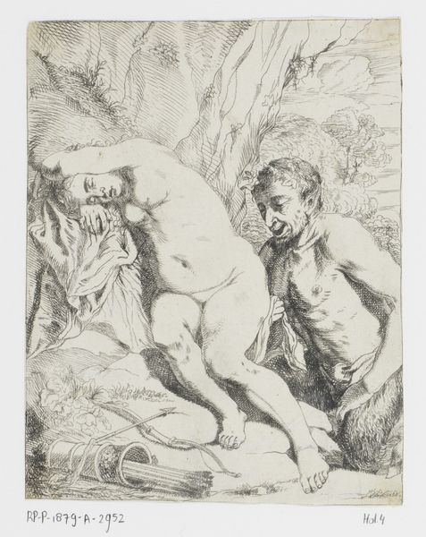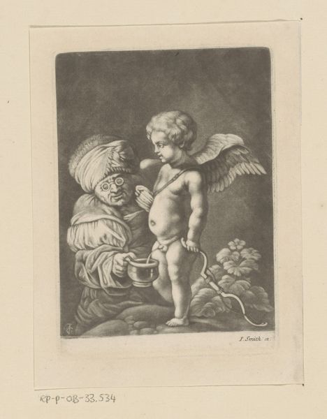 Curator: Right, let's dive in. We're looking at "Plas van Cupido wordt door een oude man opgevangen"—or "Cupid's Puddle Being Caught by an Old Man"—an engraving that historians reckon was completed sometime between 1661 and 1726. It's the work of Gerard Valck, housed here at the Rijksmuseum. It strikes me as odd, but what are your first thoughts? Editor: Honestly, slightly unsettling. The Cupid figure feels vulnerable, almost melancholic. And that old woman, or man dressed as a woman maybe?, is a study in... well, stark age, those goggles. The contrast is unsettling. The serpent he holds could be medicine related or the one from Genesis, it certainly sets my imagination loose. Curator: It's interesting that you hone in on vulnerability. It's easy to read the scene just literally—Cupid needing help—but I wonder if Valck is playing with our expectations of Eros as this powerful figure of desire. He seems almost infantile here. Editor: Exactly. It challenges that inherent association of love with some vigorous force. We're used to seeing cherubs depicted like mischievous little pranksters, but this poor guy looks…lost. And the fact that he’s, you know, created a little puddle of need really pushes this subversion further. But, look how delicately he handles that snake staff; there's experience behind him even when infantile. Curator: Symbolically, there is a dense mixture present here: Aging is a major part of the narrative but it’s a tender compassion, maybe even care taking over, or a lament even? This piece strikes an interesting cord: that one extreme, as a culture that champions youth above all, should consider there are some gifts age gives us. Editor: I think the skill of the engraving only amplifies these contrasting themes, it emphasizes the fine details. I find it makes me want to inspect the figures, as it teases me to see into their deeper states, or even meanings. The work really asks you to examine it beyond its literal title. It's like looking into a mirror and seeing something far more layered than you expect. Curator: It's true, Valck seems intent on subverting myth to remind us of realities in life, too, of a universal truth - something as potent as love can make you feel just as needy as being human can too. The use of this story is simply genius here! Editor: Indeed, such a gentle invitation to ponder our complex connection with love! Thanks for bringing this one to our attention!