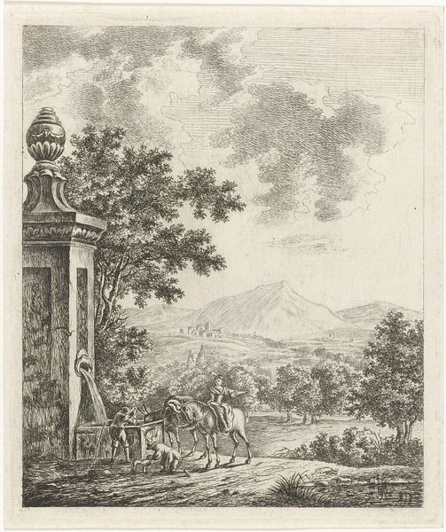Editor: Here we have Pieter van den Berge’s "Fountain with Garden Vase," an etching and engraving from between 1687 and 1744. It strikes me as such a peaceful scene, very meticulously rendered. What catches your eye when you look at it? Curator: I'm drawn to the symbols, of course. Notice how the urn, prominently placed, becomes a vessel not just for water or plants, but for cultural memory. The figures carved upon it – do they suggest specific stories, perhaps classical myths revisited? How does their presence affect our understanding of this garden? Editor: I see what you mean. It almost elevates the scene, placing it within a historical context. The figures in the garden then, do they have a connection to the urn’s imagery? Curator: Possibly. Or consider them as echoes of an ideal, a pursuit of harmony found in both nature and artifice. The fountain, the meticulously planned landscape... Aren’t they symbols of control, perhaps a wish to impose order on the unpredictable flow of life? The water becomes not just a feature, but a metaphor. What does it say to you? Editor: Hmm, maybe about humanity's relationship with the natural world? Seeking beauty while also trying to control it? Curator: Precisely! And it appears the garden alludes to a cultural and perhaps political history through the iconography on the vase itself, inviting the viewer to delve deeper into its symbolism and purpose. The very act of creating such a detailed engraving, isn't it a testament to humanity's enduring need to leave its mark? Editor: It’s fascinating how much can be gleaned from what initially appears to be a simple garden scene. I see so much more now than I did at first glance. Curator: Indeed! It’s in decoding these visual cues, that images continue to resonate across time. Each symbol echoes the cultural memory.