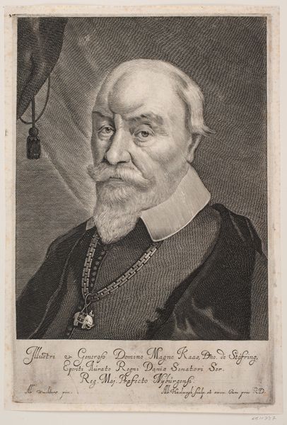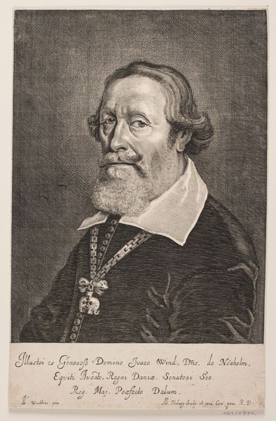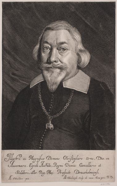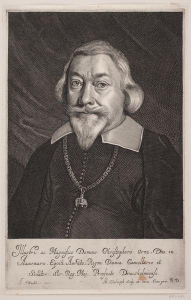 Curator: Look at this intriguing print, made between 1655 and 1659. It depicts Jørgen Seefeld and is currently housed here at the SMK. It’s by Albert Haelwegh, a master of his craft, wouldn’t you agree? Editor: Oh, he certainly knew how to handle his materials! The stark contrast gives it such a dramatic weight. It’s a study in how varying pressure and ink yield such remarkable tonality. One can almost feel the plate after it has been bitten by acid. I'm thinking aquatint and etching processes maybe? Curator: The details are astonishing, from the folds in his attire to the wisps of his hair. It seems to me that this is a man carrying both power and secrets within. Editor: Absolutely. And if you consider the time this piece was created - such skills in production, engraving these details with such care—it was definitely communicating power but also demonstrating the access the artist had to the means of representing that power. A single print could circulate an image of a leader broadly and powerfully! The type and composition here is saying, "Pay Attention, Obey". Curator: Yes, absolutely. This feels almost like peering into the soul of a man from a bygone era, doesn't it? It makes me ponder on temporality and representation. It feels incredibly moving to witness an interpretation of what was at the core of him! Editor: For me, it’s equally compelling to contemplate what has physically endured through the printing materials— the plate, the ink, the paper – the very tangible process of replication. And the hands, the artisanal hands that shaped all of these aspects into a communicable thing. A fascinating interplay of permanence and change across the years. Curator: Well, this exploration makes me appreciate Haelwegh's effort even more. Such a compelling portrait captures the weight and impermanence that haunts even the mightiest figures, as it continues to resonate even today. Editor: And to think how easily a tool in artistic hands, the printing press in this case, can distribute messages, shape power and outlast us all… Quite the compelling paradox when you truly dive in.