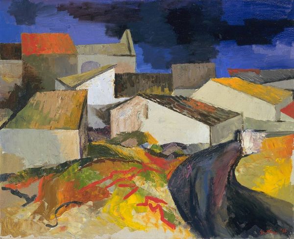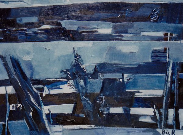Karl Knaths made this untitled painting using oil on board. Look at those flat planes of color. See how they tilt and crash into each other? It's like he’s captured a landscape, but broken it into pieces, shuffled them around, and then reassembled it, according to his own logic. The surface is alive with brushstrokes, thick and confident. In the centre, there's this tangle of black lines, like a nervous energy trying to escape the canvas. It reminds me a little of de Kooning, but with a more grounded, earthy feel. The blues, purples, and greens create this strange, brooding atmosphere. There's a playfulness in the way Knaths handles the paint, a willingness to let the medium speak for itself. It’s as though he’s inviting us to get lost in the process, to see the world not as it is, but as it could be.