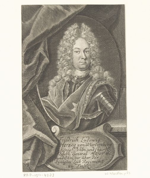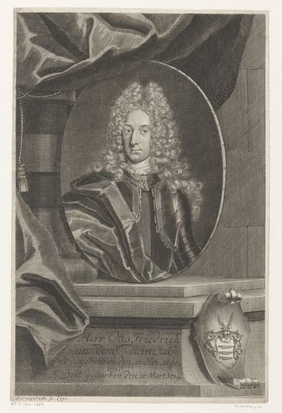 Martin Bernigeroth created this portrait of Christoph Gottfried von der Sahla as an engraving. The composition is dominated by oval and rectangular forms, softened by the flowing lines of the drapery and the subject's wig. Notice how the structural elements create meaning. The oval frame encircles the figure, setting him apart, while the rectangular base provides a stable foundation. Bernigeroth uses the contrast between the dark velvet robe and the lighter background to draw our eyes to the face. The textures vary from the smooth surface of the frame to the intricate details of the coat of arms below. Here, the arrangement invites a semiotic interpretation. The portrait frame and base act as signs of status and permanence, while the textures and fabrics signal refinement. Bernigeroth challenges any fixed ideas about class by emphasizing the sitter's individual characteristics, such as his steady gaze. In essence, the portrait uses established visual codes and infuses it with fresh information.