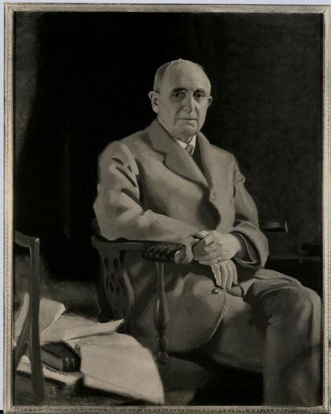Curator: This is Charles Sydney Hopkinson's portrait of Henry Pickering Walcott, currently held at the Harvard Art Museums. Editor: I'm immediately struck by the somber mood, almost a contemplative silence emanating from the figure. Curator: Indeed. Hopkinson's masterful use of chiaroscuro emphasizes the structure of Walcott's face, drawing the viewer's eye to his dignified expression. The composition relies heavily on formal balance. Editor: I find the hands quite compelling, almost intertwined, as if holding onto some unspoken wisdom or perhaps a burden of responsibility. It's an interesting contrast to the smooth, almost idealized, quality of the face. Curator: Agreed. The artist balances a realistic depiction of aging with a carefully constructed representation of authority and intellect. Editor: It's as though Hopkinson captured more than just Walcott's likeness, but also a sense of his era. Curator: Precisely; a moment frozen in time. Editor: Makes you wonder about the stories those hands could tell.