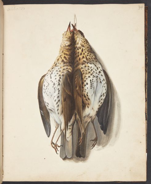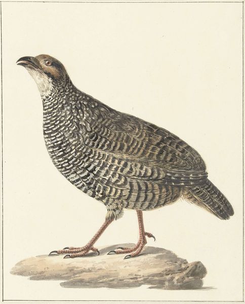 Editor: This is "Decoy," a watercolor and charcoal drawing by Wellington Blewett from around 1939. There’s something unsettling about it. The bird is so still and isolated. What’s your take? Curator: The title is key. The "decoy" speaks volumes about representation, doesn’t it? About manufactured appearances designed to lure. Blewett created this around 1939; what historical anxieties do you think may be under the surface here? Is this quiet stillness before the storm of war and changing ecological landscapes, maybe? Editor: That's interesting. I hadn't thought about it politically. It’s a little scary knowing its only purpose is to trick and potentially hurt other birds. Curator: Exactly. This reflects a specific power dynamic, a human manipulation of nature. How might we read that today in relation to the environment? It is realism in style but the stiffness evokes Surrealism, and given when it was made we can also see social parallels. Consider the concept of false fronts people may adopt within a society... Editor: So the Decoy isn't just an image of a bird. It makes you wonder about manipulation on different levels: nature, human society... That makes it more powerful and complex than it first seems. Curator: Right. Consider, for instance, the economic backdrop – how might that shape or even distort identity? We must be critical when interpreting works of art in this era to really see how that impacts meaning and representation. Editor: It is strange to consider something so seemingly simple could also have complex political implications. Thank you. Curator: Thank you, that critical viewpoint, along with yours as a rising member of our creative sector, is extremely important to our shared dialogue.