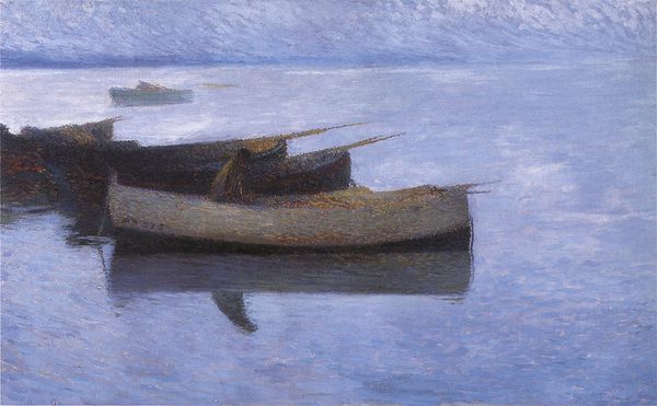 Editor: Here we have Monet's "Two Anglers," an oil on canvas from 1882. It strikes me as a snapshot of a lazy afternoon, almost dreamlike in its haziness. The water's surface seems alive with reflections. What do you see in this piece that I might be missing? Curator: Missing? Nothing, darling! You’ve already cast your net wide and caught the essence of it! But let’s tug on that thread of "dreamlike haziness." Monet, bless his heart, wasn’t just painting fishermen, he was painting *light*. The way it dances on the water, those dappled reflections...it's like visual poetry. Do you see how the figures almost dissolve into the landscape? Editor: Yes! They're part of the scene, not just observing it. Curator: Precisely! It's Impressionism at its finest – capturing a fleeting moment, an *impression*. Think about it: he's working "en plein air," battling the elements, chasing that light before it vanishes. Makes you appreciate that wobble in the boat and the blur of the trees even more, doesn't it? He had no time for tedious detail! Instead, it feels truly observed and experienced, more sensory than a photorealistic painting could ever be. Does this resonate with you? Editor: Definitely. It makes me think about how different it is to experience a place rather than just see it. Thanks so much for sharing your perspective. Curator: And thank *you* for your astute observations! It’s easy to get caught up in art history, but your personal connection is what truly brings a painting to life. A lazy afternoon suddenly has new depths, no? Editor: Absolutely. I'll never look at a landscape the same way.