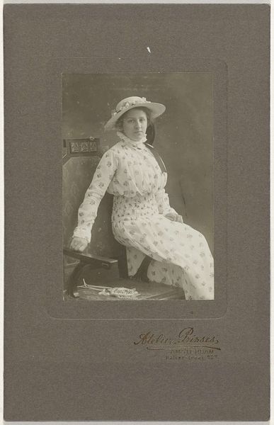 Editor: This is a photograph entitled "Portret van mevrouw M.C. Lucassen-Van Idsinga met hoed en jurk zittend op een bank," which roughly translates to "Portrait of Mrs. M.C. Lucassen-Van Idsinga with hat and dress sitting on a bench," by Else Weissenborn, dating from around 1907-1910. It's a gelatin-silver print, giving it this soft, almost dreamy quality. What do you make of it? Curator: Dreamy is an excellent way to put it. The overall image certainly carries a symbolic weight regarding beauty and perhaps a certain innocence. Observe the hat and the dress; both are adorned with floral motifs. Flowers are potent symbols of femininity, but also ephemerality, reminding us of the fleeting nature of beauty and youth. What does that tell you about how women were seen and saw themselves during this time? Editor: That's interesting! I hadn't considered the flowers on the hat and dress as anything more than decorative. So you think they suggest something about the role of women in society at that time? Curator: Precisely. Her stillness and poise speak volumes. The bench, while appearing ordinary, can represent a pause, a moment of reflection. Even the light seems intentionally diffused, casting a halo effect around the sitter, elevating her but also somewhat distancing her from the everyday. Do you get a sense that this image speaks beyond just one person and time? Editor: Yes, definitely. It feels like a timeless image of womanhood. I guess I hadn't thought about all those layers of meaning behind what seemed like a simple portrait. Curator: And that's precisely where art reveals itself—in the layers of cultural memory embedded within these symbols. Think of the Impressionists: it also recalls pictorialism in photography at this time. It makes you think about the many other symbolic interpretations embedded within photographs that were thought to just document reality. Editor: That makes me see it completely differently. It's more than just a picture; it's a cultural artifact. Thanks so much for opening my eyes!