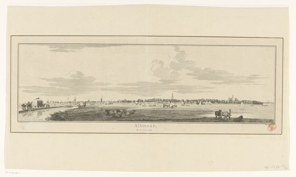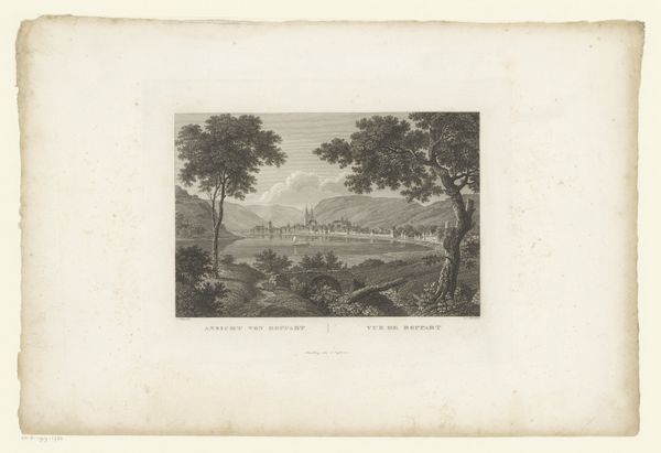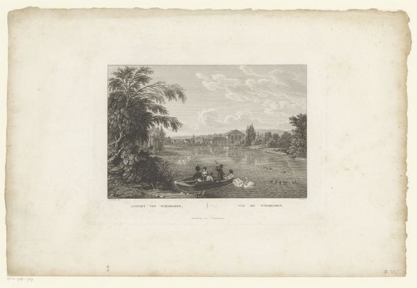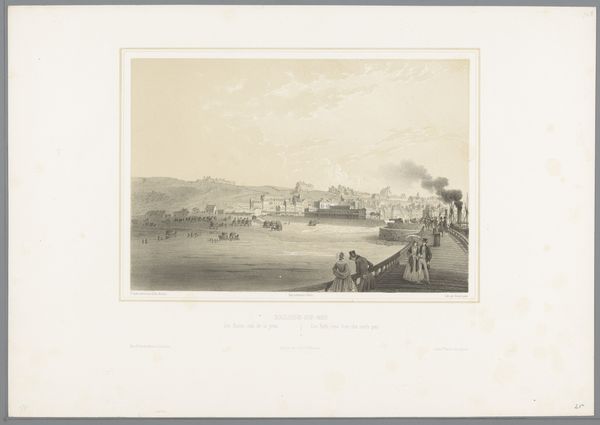 Editor: Here we have "Arnhem vanaf de Rijn gezien," or "Arnhem Seen from the Rhine," a print from somewhere between 1812 and 1887 by Frederik Lodewijk Huygens. It's incredibly detailed, almost photographic. What catches your eye in this cityscape? Curator: It's interesting you say photographic because even with all the detail, it has a definite painterly, romantic feel, doesn't it? The light feels…curated, wouldn’t you agree? What’s particularly fascinating to me is how the artist balances this idealised vision of leisure - look at the figures relaxing by the riverbank – with the burgeoning industry suggested by the steamboats. What does that contrast say to you? Editor: That’s a great point, I hadn’t considered that tension. So it’s this push and pull, between this romanticized past and a glimpse into a very different, industrial future. Do you think that commentary on societal change was intentional? Curator: I think intention is always a slippery eel to grab ahold of when looking back. But clearly, these newfangled contraptions had entered the artist's world and therefore his vision. And yes, absolutely a deliberate snapshot in time that speaks to how people were processing change. Like pressing pause on the river to let it sink in. You know? Editor: Absolutely. It makes you wonder how they truly felt about it, happy about progress, or perhaps a little anxious. Thanks so much for sharing! Curator: My pleasure! Always fun to paddle in the waters of art history together, even if the current is always changing!