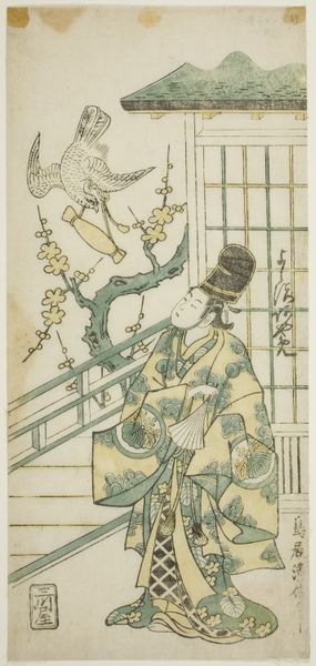 Editor: Here we have Torii Kiyomasu II's "The Actors Onoe Kikugoro I and Utagawa Shirogoro" from around 1747, a woodblock print that just exudes a sense of stillness. The two figures seem caught in a moment of quiet reflection. What stories do you see unfolding in this piece? Curator: Stories indeed, softly whispered on the breeze, perhaps. For me, this image pulses with the very heart of Ukiyo-e—the fleeting, transient beauty of the everyday. Think of it: actors, caught not in the blaze of performance, but backstage, perhaps composing themselves, or quietly biding their time. It is about the liminal space before the storm. Doesn't it make you wonder, what roles did they embody, and how much of their own souls did they pour into each portrayal? Editor: That’s beautiful! It really does invite contemplation. I love the contrast between the actor standing with the staff and the seated one looking almost burdened. Curator: Notice also the delicate use of line and color. Kiyomasu II’s hand wasn’t merely tracing outlines; it was breathing life into the very essence of these performers. The slight asymmetry, that humble imperfection. You can feel the human hand. Doesn't that human quality contrast sharply with the rigid grid behind them? And isn't that a comment in itself, that tension between artifice and lived experience? Editor: I didn't think of the grid like that. It is as if life is contained by constraints that can not be removed. It all really brings this work alive! Curator: Indeed. It's like a half-remembered dream, isn't it? Something glimpsed through a veil. And art, after all, is about making us feel the unseen currents of our own souls. That's where the true magic lies.