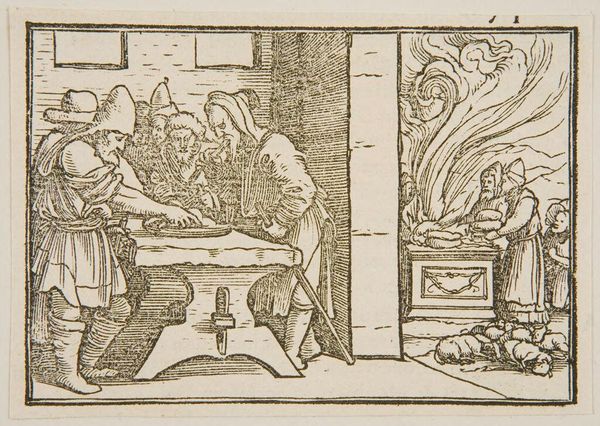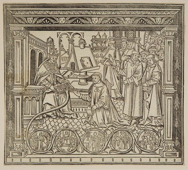Curator: Hans Holbein the Younger created this woodcut, "2 Chron. I". It depicts a kneeling figure before a menorah. Editor: My first impression is somber. The stark lines and the figure in prayer evoke a sense of solemnity. Curator: Holbein's work often reflects the political and religious tensions of his time. The setting, possibly representing Solomon's Temple, would have had significant resonance amid Reformation debates. Editor: Absolutely, the menorah itself becomes a potent symbol. Light, knowledge, divine presence—it speaks to a deeper yearning for spiritual guidance. Curator: Considering the historical context, it's tempting to view this image through the lens of power dynamics. Who is allowed to interpret these symbols and for whose benefit? Editor: I agree. This piece reveals the enduring power of visual symbolism to carry memory and shape cultural identity, even across centuries. Curator: It's a reminder that these images aren't static; they continue to evolve and challenge our understanding of the past and present. Editor: Precisely. Seeing the layers of symbolism enriches our experience of the piece.