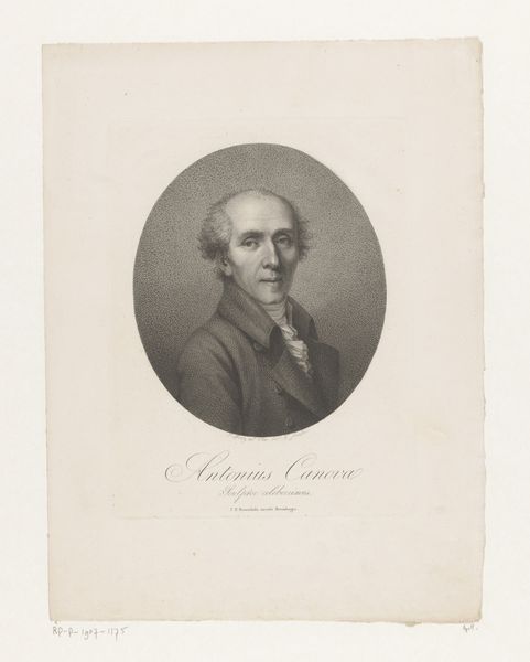 Jacob Merz made this portrait of Antonio Canova using etching and drypoint. Look closely, and you will see the image is created from thousands of tiny dots and lines incised into a metal plate. The magic of this print lies in its materiality, and the delicate way the artist worked the metal. The etching process allowed Merz to create fine, consistent lines, which he then built upon using the drypoint technique, scratching directly into the plate with a sharp needle. This created a burr, a rough edge that catches the ink, resulting in the soft, velvety lines we see here, particularly around Canova’s face and hair. The printmaking process also speaks to the social context of the art world at this time. While Canova was celebrated for his unique sculptures, printmaking allowed for wider dissemination of his image, catering to a growing market for portraits and art reproductions. This speaks to an emerging modern culture, where the status of the artist was elevated, and their likeness became a valuable commodity. By considering the materials and making of this print, we gain a richer appreciation of its cultural significance, highlighting how even seemingly simple portraits are deeply embedded in broader social and economic trends.