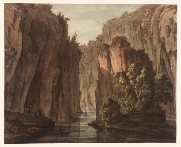 Curator: Ah, "Landscape with Hills and a Lake," created somewhere between 1767 and 1777 by William Gilpin. Look at this moody little drawing! Editor: Mmm, immediate feeling? Dramatic solitude. It’s got that classic romantic feel. Like a stage set for some internal tempest. All in greyscale—talk about stripping it down to essentials. Curator: Gilpin was obsessed with the "picturesque." He travelled around cataloging landscapes. This piece, made with charcoal, ink and pencil, almost seems to distil his theories on composition. Note how he layers the rugged terrain. Editor: The figures down in the foreground...they feel dwarfed, don’t they? As if placed there to emphasize the sublime terror of nature. And those craggy peaks, silhouetted against a somewhat melancholic sky, speak to something deep in the human soul. Curator: Absolutely. The light in this is superb, wouldn't you agree? Look at the stark contrast as it reflects off the imagined lake. A real beacon! Plus, Gilpin uses tone like others might use a full color palette. Editor: Indeed. Light and dark doing the heavy lifting, tonally shaping everything in a balanced pictorial language! It’s all about contrasts – the smooth lake versus the jagged cliffs, the insignificance of man versus the overwhelming force of nature... It makes you think about time, impermanence... Curator: Don't you love it! A perfect memento mori then? And remember he's using this artistic lens to not only appreciate the landscape but also to assess its value in social and economic terms! It’s about defining an ideal, isn't it? Editor: So it is, yes, a vision in service of societal and class values that continue even today to frame our visual engagement in so many different spaces. A tiny sketch doing a very big job of perpetuating ideas of aesthetics. I leave feeling suitably insignificant AND profoundly reflective. Curator: Me too! Gilpin has offered me once again a different angle for a familiar debate that somehow doesn't lose its grip over the ages, even in an era like ours.