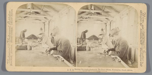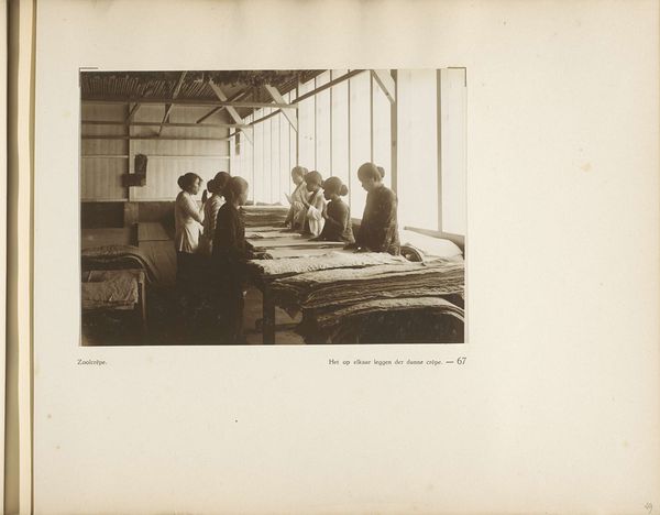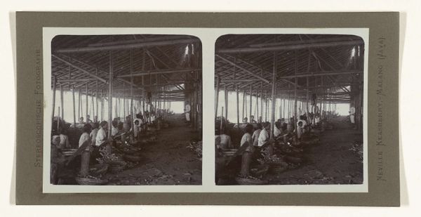 Curator: Immediately, I’m struck by the repetition. It's almost dizzying. So many people bent over… and that silvery light, almost ghostly, reflecting off what looks like piles and piles of tobacco. Editor: And it is indeed piles of tobacco leaves we see here. This is a gelatin silver print entitled “Sorting the Picked Tobacco Leaves," created sometime between 1900 and 1935. Through the lens of Neville Keasberry, we witness an industry reliant on human labor. Curator: "Sorting", that's doing an awful lot of work for that title! But the simplicity is striking, like the calm before a storm, the lull before the global market machine swallows everything up. Look how vulnerable the workers are positioned here, under that imposing scaffold. It’s a brilliant composition, showing the architecture dominating the people… but the people make the photograph, and, by extension, the market what it is. Editor: The image invites us to consider how labor, particularly in colonial contexts, shapes both landscapes and lives. Consider the relationship between the workers, largely anonymous in the photograph, and the end consumer. How often do we consider these complex networks of production when indulging in everyday habits? Curator: Never, probably! The geometry, though! It makes me think of Foucault, and the concept of panopticism. Are these people really sorting tobacco, or are they performing a show of labor? I feel I'm complicit in viewing it... I can't look away. Editor: Exactly! We are positioned as overseers, which raises difficult questions about our own gaze. Think about the labor rights, consider gender, consider cultural extraction… Curator: All those layers hidden within those muted grays and browns! The leaves are arranged like offerings or sacrifices! And they probably were… given the circumstances. It hits you in the gut after a while... Doesn't it? Editor: It does. It is in viewing, questioning, and engaging with images like this, that we find our way to critical consciousness. Images from the past still hold a powerful presence in the present.