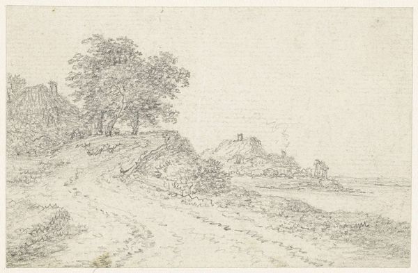 Curator: Georges Michel created this work, titled "Landweg naar een boerderij; links twee zittende boeren", sometime between 1773 and 1843. It's rendered with pencil. Editor: The delicacy of line gives it such a hushed, melancholic feeling. There's almost nothing there, and yet the space feels complete. Curator: Indeed, it exemplifies the artist's ability to evoke mood through minimal means. Notice how the varying densities of pencil strokes articulate depth and form, establishing the receding lane to the farm buildings. What is remarkable here, it feels like it could be studies from his sketchbook where the artist captured the relationship between the farmers' daily lives and their working landscape. Editor: Yes, the emphasis on this working landscape highlights labor and materiality. Look at the construction of the thatched roofs. The pencil lines become almost sculptural. We can clearly appreciate the craft, labor and effort involved to produce or built thatching by a master thatcher in such environments. Curator: Absolutely, the thatched roofs and the modest dwellings of the farmer show the hard manual labor in rural landscapes, yet the landscape evokes beauty that celebrates nature that also sustains their survival and life, but note the lack of sharp boundaries. Edges are blurred which enhances the dreamlike character. This suggests a desire for social transformation through a romanticized return to nature. Editor: The interplay between shadow and light also provides much of the expressive charge of the work, but I question that presumed romanticization of rural toil; it presents the material realities of the countryside through subtle variations. Curator: I appreciate how it bridges observational sketching with a poetic feeling that captures the everyday experience for working people from these communities. Editor: Ultimately, whether we view it through the lens of production or visual construction, the work's profound elegance offers something compelling and timeless.