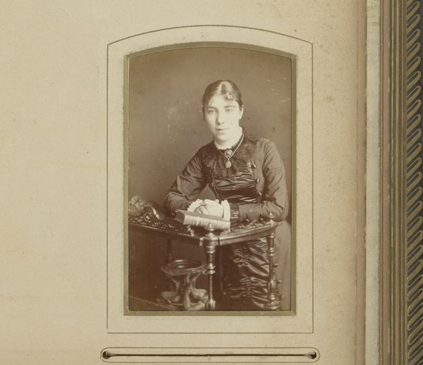 Editor: This photograph, "Portret van een vrouw" – or "Portrait of a Woman" – from somewhere between 1860 and 1900, really captures a particular time, doesn't it? There's a quiet stillness about her pose and the sepia tones enhance that mood. What symbols or details stand out to you when you look at this image? Curator: Indeed, that quiet stillness speaks volumes. Notice her jewelry: the pendant, small earrings, they suggest something beyond mere adornment. Ask yourself: what might the pendant symbolize to her? Is it a memento? A marker of status? Or something altogether more personal and intimate to this woman? These accessories, even her carefully chosen garments, acted as visual markers, defining an individual's place and purpose within society. It speaks of unspoken stories from the Victorian era. Editor: I hadn't thought about the necklace that way, it just seemed pretty! Curator: Its prettiness is part of its power! Beauty in portraiture is rarely simple decoration. Also, see how she poses. Her crossed arms indicate a subtle protection from the public, right? This visual barrier suggests more about her internal landscape; it projects an aura of considered reservation in keeping with Romantic and Victorian sentimentality. Do you notice how it's presented within the book format? It memorializes a moment, a sentiment…it evokes a longing for an absent presence. Editor: It makes you wonder about her life. It really adds layers. Curator: Precisely. The seemingly straightforward portrait becomes a layered artifact of history and a coded image, resonating with collective and cultural symbolism across time. What a powerful means of reflecting who she was to those she left behind! Editor: I never thought I could find so many readings into one photograph, but it's a new way to examine and view art, and how we use these images in remembering others. Thank you!