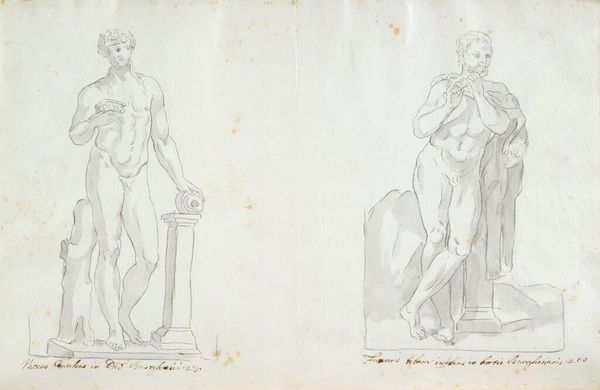 Editor: Here we have an anonymous drawing, "Ludovisi Mercury and Ludovisi Pan and Syrinx," housed at the Harvard Art Museums. I'm really struck by how these classical sculptures seem to float on the page. What draws your eye to this piece? Curator: Oh, it's the dance between control and freedom, isn't it? The artist meticulously renders these ancient figures, capturing their form, but the monochrome washes and delicate lines evoke a sense of ethereal detachment. I wonder, does it invite us to consider our relationship to history? Are we bound by it, or can we reimagine it through art? Editor: That's a beautiful thought. It feels like we're seeing them anew. Thank you! Curator: My pleasure! It's pieces like these that make you pause and ponder the nature of time itself.
