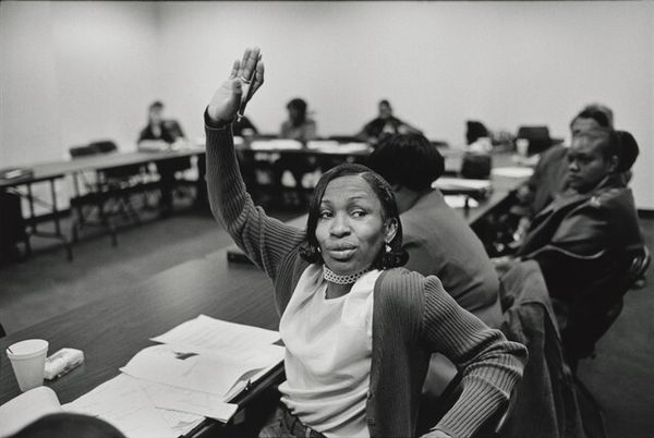 Editor: This is a gelatin-silver print photograph from 1993 by Nancy Andrews, titled "Roberta Achtenberg". She's being sworn in, it seems, with a crowd of faces behind her looking on. The mood feels very serious, weighty even. What resonates with you when you see this, beyond the surface? Curator: The black and white choice does add weight, doesn’t it? Think about the symbolism inherent in the swearing-in. That raised hand is a pledge, a promise—a beacon, almost—amidst the sea of faces. Nancy Andrews captures this moment with a delicate power. Each face in the background reflects a different expectation. Now, consider: How does knowing this photo was taken during Achtenberg's nomination as Assistant Secretary for Fair Housing and Equal Opportunity shift your perspective? Editor: Oh wow, knowing that context, her raised hand feels like a challenge, not just an oath. There’s a real sense of history being made, and Andrews captured it so powerfully in a moment. It really does create layers of interpretation, I agree! What I find powerful is Andrews’ capability to show someone with the authority to change our perceptions and rules within our environment and culture. She has become such a great part of a story and moment in time. How do you feel she represents our modern environment and world? Curator: Exactly! It's a pivotal moment immortalized, wouldn't you say? Thinking about it now, perhaps that's where our future lies—in recognizing and supporting people who are unafraid to stand up and challenge the status quo, and what the rules could be within the environment they live. That being said, art has such a beautiful fluidity for interpretation, but what’s most intriguing is how it has helped reflect ourselves into what’s possible within a diverse world. Editor: Absolutely. I'm starting to see it now with more depth. The photograph isn't just capturing an individual's moment; it's freezing a collective hope. Thanks so much for providing a rich understanding!