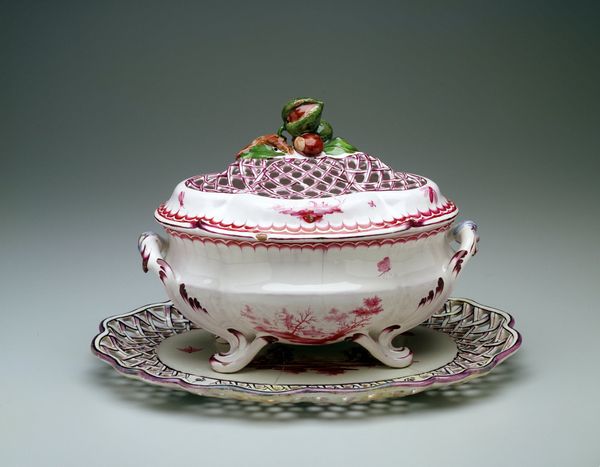 This covered bowl was made by the Chelsea Factory in England, sometime between 1742 and 1784. It is crafted from soft-paste porcelain and ornamented with molded and applied decorations. The Chelsea Factory was among the first porcelain manufacturers in England, producing luxury goods for a wealthy clientele. By the mid-18th century, such factories had become important sites for the production and consumption of visual culture. The delicacy of the bowl, along with its naturalistic motifs of strawberries, flowers, and insects, speaks to the Rococo tastes of the period. But beyond its aesthetic appeal, the bowl also reflects the social hierarchies of the time. Porcelain was an expensive material, and only the elite could afford such wares. To truly understand this object, we might consult factory records and period inventories, tracing the circulation of porcelain and its role in shaping social status.