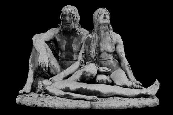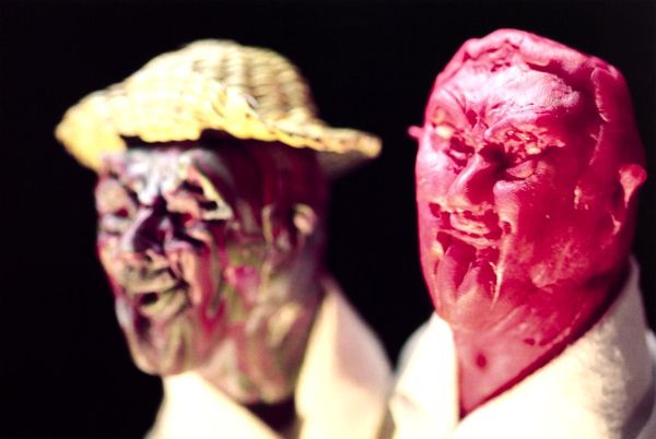 Editor: This untitled piece is by Thomas Schütte, held at the Tate. These two figures are… intense, almost grotesque. What kind of cultural memories do they evoke for you? Curator: The figures certainly present a potent image. The floral shirts juxtaposed with those almost militaristic caps create a dissonance. Does it remind you of any figures from history? Editor: Maybe peasants or soldiers, like some dark fairytale figures? What is the artist trying to convey with this symbolism? Curator: Perhaps a duality of tenderness and power? The contrast between the domestic floral pattern and the rigid caps suggests a complex relationship. Editor: I see, a blend of vulnerability and authority. Thanks, that really adds another layer to my understanding! Curator: Indeed, it's a potent exploration of contrasting symbols and their enduring psychological resonance.