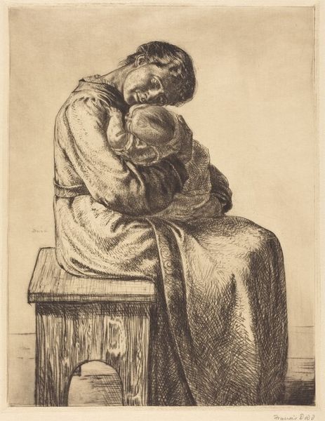 Curator: Before us, we have Jean-François Millet's pencil drawing, "Zittende vrouw met baby bij een open raam," created sometime between 1824 and 1875. It currently resides at the Rijksmuseum. Editor: It’s surprisingly tender. The softness of the pencil work lends an almost dreamlike quality to the scene. There is an overall delicate tonal arrangement where the texture feels subdued yet quite descriptive. Curator: Absolutely. Millet often depicted peasant life with a focus on the dignity of labor and everyday struggles. The socio-political context of mid-19th-century France, particularly the growing urbanization and displacement of rural populations, influenced artists like Millet to portray the lives of those left behind. His pieces often championed their virtues and hardships. Editor: One sees that tenderness most evidently in the mother’s downcast gaze. Notice how her face is shaded to invite the eye toward the baby. This contrasts with the outside visible through the window—everything appears sketchier and looser. This juxtaposition of clarity and ethereality helps underscore this mother's personal domain. Curator: The window suggests that this image could act as social commentary, suggesting the outside world is beckoning towards modernization and new opportunities; at the expense of a life inside defined by maternal care. We might imagine then what future awaits them both as urbanization progresses around them. Editor: Perhaps. Yet there is something to be said of the geometric rigour of the composition. The strong verticals of the window and the more oblique lines of the bed anchor the central grouping. It suggests that she is self-contained in her world. She is, at the heart of it all, monumental. Curator: It’s fascinating to consider the potential intentions of Millet given the time. Realism sought authenticity, but romanticism desired sentimentality and grace. He perhaps blends these ideas—or is conflicted by them, we may never know. Editor: Precisely. He walks the formal boundaries. The piece has so much weight but it is a lightweight pencil on paper, quite astounding. Well, regardless, it's certainly given me a few avenues of approach. Curator: And I think it's revealed layers beyond the immediately visible. Thanks for your sharp perspective!
