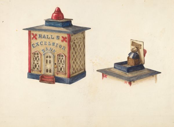 Editor: So, this is Samuel Klein's "Penny Bank," circa 1939, a drawing and watercolor painting. It kind of reminds me of a stage set for a children’s play. The little brick facade and perfect rows of windows… it’s almost too cute! What jumps out at you? Curator: Well, firstly, it's fascinating how a mundane object, a penny bank, is elevated to the level of art. It’s as if Klein is saying, “Even the simplest things are worthy of our attention, of our *gaze*.” I love the use of watercolor; it gives the whole thing a delicate, almost dreamlike quality, don't you think? It invites a childlike sense of wonder. And the way he captures light... Have you noticed that gentle dance? Editor: I do, yes, especially on the little tower on top. It's interesting that you mention the light, given the era in which it was painted; The Great Depression was ending. I hadn't connected that dreamlike quality with a longing for more secure times... Curator: Precisely. What appears "too cute," as you put it, may actually mask deeper anxieties about financial security. It makes you consider the optimism of childhood and the weight of reality. Art often has this sneaky way of embedding complexity. Does this change your initial impression? Editor: Definitely! It feels heavier now, somehow. Like it’s more than just a pretty picture. So much for seeing a children’s play! Curator: Exactly! And, for me, that’s the beauty of it. The artist reveals that appearances often conceal deeper and more resonant meanings if you spend a little time gazing upon them. I'll always try and offer you the space for that journey to unfold. It’s what makes the art… alive!
