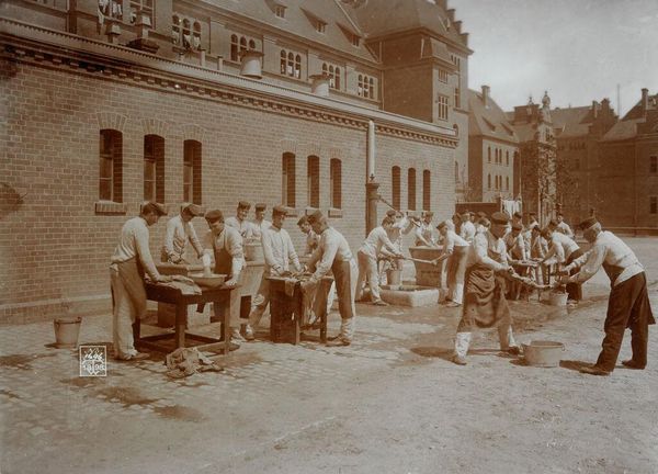 Curator: This photograph by Frances Benjamin Johnston captures a harness-making class at the Hampton Normal and Industrial School in Virginia. Editor: It's striking. There's a palpable sense of industry, but also a quiet dignity in their focused expressions. Curator: Indeed. The image invokes the symbolism of the Hampton Institute’s mission—offering vocational training to African Americans and Native Americans post-Civil War. Note the structured environment. Editor: The brick walls almost feel like a framework, encasing the promise of upward mobility, yet simultaneously hinting at the constraints of the era. All these men working together with purpose. Curator: The act of harness-making itself is symbolic too; representing connection, control, and perhaps even a subtle rebellion through skilled labor. Editor: It's interesting how a single image can hold so much weight—a visual document of education, aspiration, and the complex realities of its time. Definitely leaves an impact.