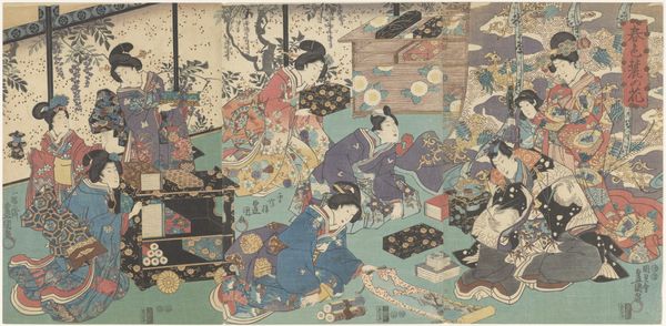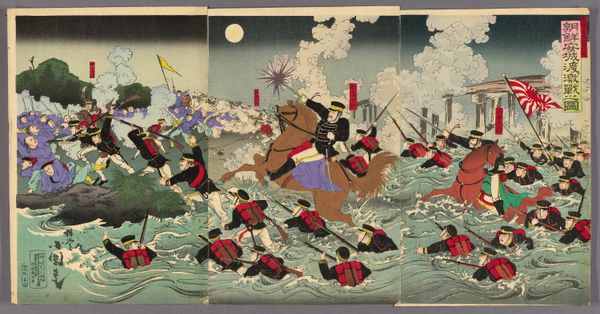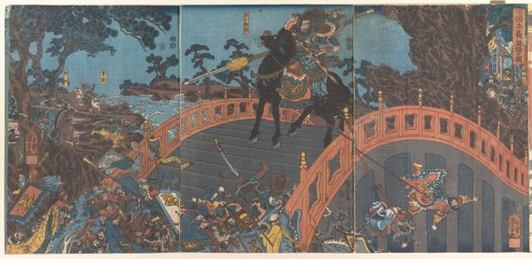 Editor: This is "One of Fifteen Triptychs of Famous Battlescenes," a 19th-century woodblock print by Utagawa Kuniyoshi, currently held at The Met. The detail is astonishing, a flurry of activity frozen in a single moment. What can you tell me about its broader significance? Curator: This work, like much ukiyo-e, offers a window into the social and political climate of its time. Battle scenes weren't just about depicting warfare; they were often loaded with messages about loyalty, sacrifice, and the established social order. Kuniyoshi’s romanticized depictions of historical battles bolstered national identity and Samurai ethos during a period of shifting power structures. What kind of dialogue do you think prints like this facilitated in 19th century Japan, in a context of urbanization and changing class structures? Editor: So, beyond the visual spectacle, this triptych may have served a propagandistic role, reinforcing traditional values in a rapidly modernizing society. I hadn't considered the relationship between artistic representation and political agenda in this detail. Curator: Exactly. The *samurai* weren't just warriors, they embodied an ideal. Think about how this romanticized portrayal of military prowess might resonate with a populace facing internal conflicts and Western pressures. What kind of social and historical factors can give an added resonance to a military hero on horseback? What are the nuances that we might be missing from a modern Western viewpoint? Editor: The element of cultural pride would definitely stand out for contemporary viewers. This artwork then becomes less about objective historical record, and more about the construction of identity through a curated past. Curator: Precisely. And who gets to curate that past, and whose stories are centered, are key questions. Examining this work through that lens encourages us to unpack the complex interplay of art, power, and cultural narrative, then and now. Editor: Thank you, I see it with a completely different understanding now. It's about power and identity on multiple levels.