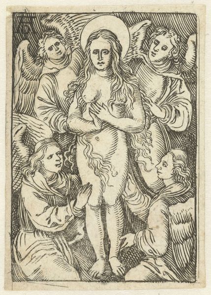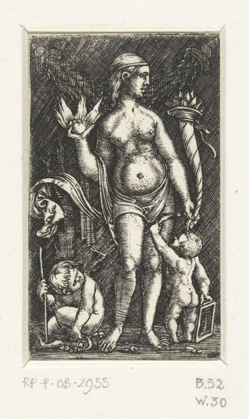 Curator: Here we have "Three Putti with Armour," an engraving crafted between 1525 and 1550 by Sebald Beham, now residing at the Rijksmuseum. What strikes you initially? Editor: My first impression? These aren't exactly cherubic angels. There's a weightiness to their expressions, almost a sense of burdened seriousness, despite the chubby cheeks and playful armor. Curator: It’s a compelling tension. Beham, as part of the German Renaissance and Reformation, lived through immense social upheaval. This print appears during a time of challenging shifting views on children's innocence and potential inherent sin. How do we then portray children as symbols? Editor: Right, these aren’t your typical, innocent putti. The helmet and shield are classic symbols of power and defense. It almost hints at this notion of innocence already burdened, or perhaps co-opted, by the potential for earthly conflict. The symbolism asks, at what stage of development are we inducted into ideology? Curator: The socio-political implications here can not be dismissed. There’s a debate surrounding iconoclasm happening during Beham’s time. Are the putti stand-ins, proxies, for grander ideas, like, say, religious icons now stripped bare? What kind of political reading could you interpret, based on that reading? Editor: I find it incredibly provocative, in the face of the Reformation's views on corruption, this composition makes me think of an emerging sense of children shouldering cultural guilt, not inheriting simple innocence. It plays on earlier Renaissance ideas, subverting visual and philosophical idioms by giving new psychological textures. Curator: Absolutely, and that interpretation adds another layer to Beham’s visual commentary. Thank you for offering a fresh angle of analysis. Editor: It's a perspective built by visual semiotics. Seeing this now offers a new avenue of consideration on Reformation social anxieties and historical memory.