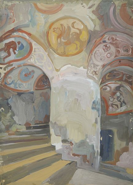 Yuriy Khymych captured this interior view of the Sophia of Kyiv using watercolor, a medium prized for its portability and immediacy. But let's consider what is actually being depicted here: a space laboriously constructed over centuries. Its architecture and decoration, including the icons on the walls, stand as a testament to the many hands involved in its creation. The church's ornamentation suggests the work of mosaicists, stone carvers, and painters who employed time-honored techniques to construct this important landmark. The image almost seems to acknowledge this history, with the watercolor thinly applied to the paper, like the work of the church slowly revealing itself through time. Khymych’s choice of watercolor, a readily available material, contrasts sharply with the skilled traditions and labor-intensive processes evident within the church itself. It can be appreciated as a readily available and transportable medium, perfectly suited to the artist's task of capturing the splendor and depth of the church interior. Ultimately, this work prompts us to think about the dialogue between different kinds of making, and how they reflect the social, cultural, and political contexts from which they arise.