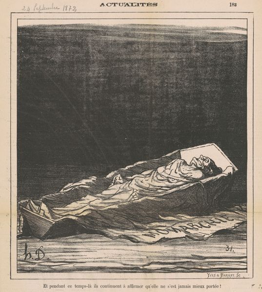 Curator: Édouard Manet's etching and aquatint, "Dead Toreador," created between 1867 and 1868, presents a stark, unflinching vision. It's part of the collection at the SMK, Statens Museum for Kunst. Editor: Wow. It hits you, doesn't it? So final. The figure just... sprawled. All the fight gone out of him. There's something incredibly lonely about it too. Curator: Indeed. Manet plays with the stark contrasts achievable through the etching process, really emphasizing the textures. Look at the stippling used to denote the sand, in contrast to the smooth areas meant to delineate fabric. This texture is something that could be further investigated. Editor: It's interesting; it makes you wonder what happened. Like a story cut short. There's an abandoned cloak or a flag on one side which might provide the clue of that very cut. The way he's just *there*... lifeless but somehow also monumental. You know, a weird kind of glory. Curator: His rendering of light, or perhaps the absence of light in some sections, certainly influences our perception. Note the areas of deep shadow that obscure detail. The subject's expression, for example, remains somewhat unknowable due to this artistic choice. The semiotics of such choice have deep connections with mortality themes of art history in the 19th century. Editor: Almost cinematic, isn't it? Like the last shot of a tragic movie, or a theatre stage where all action has passed, lights dimmed for a second to create a feeling before the curtains. All eyes, that could have witnessed a dance for life, now close still. It captures that moment. Curator: Precisely. Manet challenges conventional approaches by foregrounding death in an unusual composition, where narrative expectations of heroism give way to this sobering scene, achieved through very careful application of form. Editor: It does make you think about mortality in general. You're right about how starkly he presents it. And how he invites you into this still space. Well, I'm surely humbled. What else to add to this sad silence? Curator: Yes, the dialogue Manet creates here about our finitude seems strikingly timeless, given the work’s materiality.