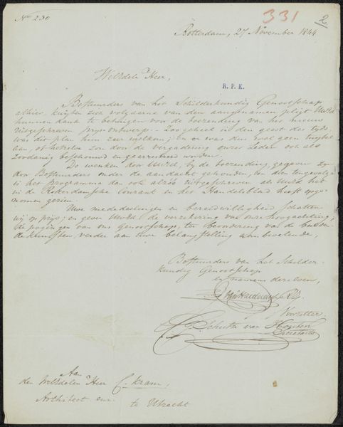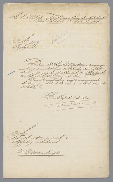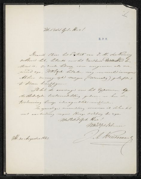 Christiaan Godfried Schutze van Houten created this letter to Christiaan Kramm in 1869 with ink on paper, demonstrating how language becomes a visual art form. The elegant cursive script dominates the composition, creating a rhythm across the page. Note how the artist varies line weight, thickening strokes for emphasis and thinning them for flourish. The ink's dark hue contrasts sharply with the paper, highlighting the textural quality of the writing. While seemingly straightforward, the letter invites us to consider the semiotics of handwriting. Each stroke acts as a signifier, conveying meaning beyond the literal words. The letter isn't simply a message; it's a performance, a visual representation of social and intellectual exchange. Consider how the composition, with its careful arrangement of text and signature, challenges fixed notions of communication. In the end, this letter functions as both a document and a piece of art, blurring the boundaries between the functional and the aesthetic.