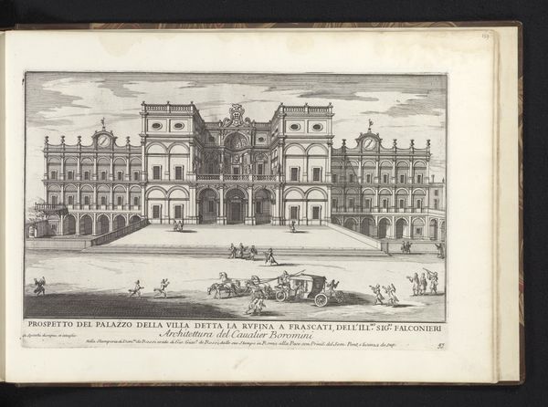 Editor: This is "Palazzo Colonna di Sciarra te Rome" by Alessandro Specchi, created in 1699. It’s an engraving, so ink on paper. It looks very precise and orderly, almost like an architect's blueprint rather than a landscape. What do you see in this piece, particularly beyond the visual representation of the building? Curator: What I find compelling is the intersection of labor, production, and representation it embodies. Consider the process: the initial architectural plans, the labor of translating that into an engraving – a *print*, made for dissemination, for consumption. It was never meant to be “high art”, and what could a closer inspection of this ‘craft’ unveil? Editor: So, you’re saying it's important to look at who made it and *how* it was made? Curator: Precisely! Think about the engraver, meticulously etching the lines. Each line represents a conscious decision, translating three-dimensional architecture into a two-dimensional plane, facilitated by reproducible material. This speaks volumes about the intent. This isn’t about individual artistic genius, but about disseminating architectural information. Editor: It’s less about self-expression, and more about information and circulation. How might the engraving process itself influenced the style of the work? Curator: Notice the linework. Its precision enabled the exact reproduction of architectural features. The print isn’t trying to romanticize; it is providing something useful. What can be gathered, as well, about its place in Rome’s architectural history or political background? What stories does it have to share with others? Editor: So, we’ve moved beyond just *seeing* a pretty building to understanding its production and purpose. That is incredibly insightful. Curator: Indeed. By focusing on the materiality and means of production, we uncover layers of meaning beyond the immediate aesthetic.