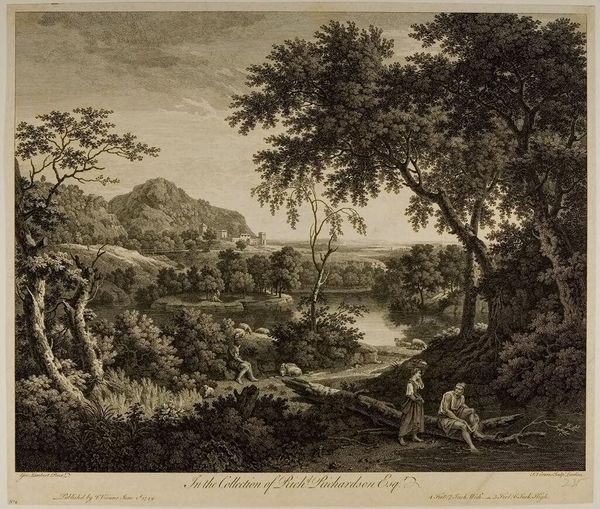 Curator: This is Jacques Prou’s etching, simply titled Landscape. The crisp, wiry lines create a rather idyllic scene, wouldn't you agree? Editor: Yes, an idyllic scene built upon the backs of laborers, I'd wager. Look at the figures, dwarfed by the landscape and their labor seemingly endless. Curator: You see exploitation, I see compositional balance. The placement of the architectural elements against the natural forms is quite striking. Editor: Balance at the expense of human dignity. The composition mirrors a social hierarchy, with the elite structures elevated and the working class literally grounded. Curator: I appreciate your perspective, but I think we can also appreciate the artistry itself. Prou's masterful handling of light and shadow creates depth and texture, regardless of social commentary. Editor: The artistry cannot be separated from the context. Prou, as a court artist, was inherently implicated in the power structures of his time. Acknowledging that enriches, not diminishes, our appreciation. Curator: Well, I suppose we each see what we are looking for. Editor: And perhaps what we choose to ignore.