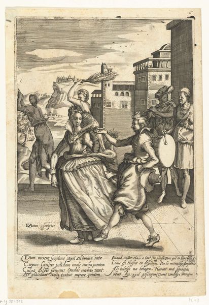 Jan Punt made this engraving, Hypermnestra wordt neergestoken, sometime in the 18th century. Engraving is an intaglio process, where the image is cut into a metal plate, in this case copper, using a tool called a burin. Notice the remarkable detail achieved through these carefully incised lines. Ink is applied to the plate, then wiped away, remaining only in the carved grooves. The plate is then pressed onto paper, transferring the image. Consider the labor involved in creating this image. The artist would have needed to be highly skilled in drawing and metalworking. The process is slow and deliberate, requiring patience and precision. This print was likely produced as part of a larger series, intended for a growing market of consumers who desired affordable images. The print medium allowed for the mass production of images, making art more accessible. This engraving demonstrates the complex relationship between art, craft, and commerce in the 18th century.